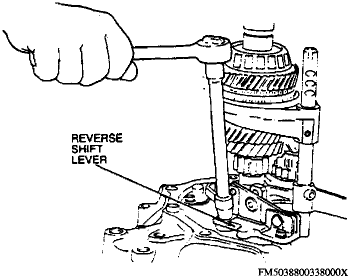 13. Remove reverse shift lever, lever set spring, and roll pin from 3-4 shift fork and rod.