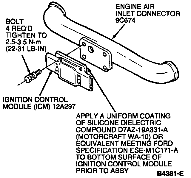 1. Apply an even coat of approximately 0.80mm (1/32 in) of silicone dielectric compound or equivalent to mounting surface of ignition module. Install module and retaining bolts. Tighten bolts to 22-31 in lb (2.4-3.5 Nm).