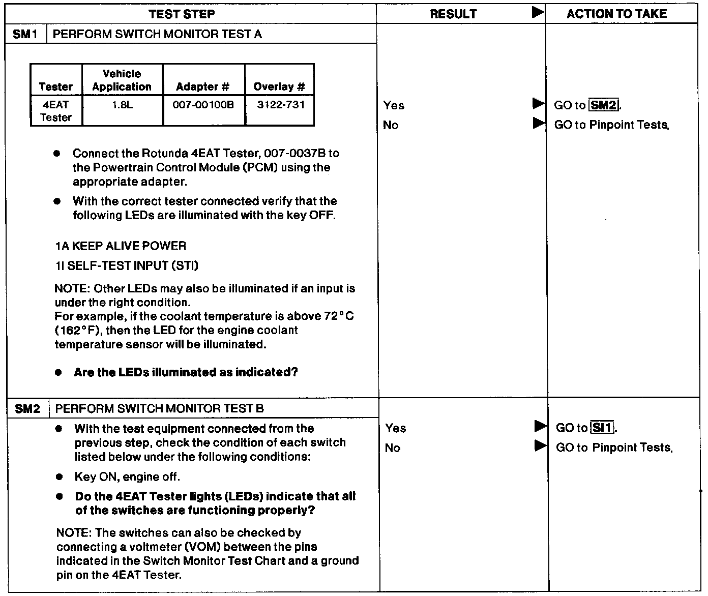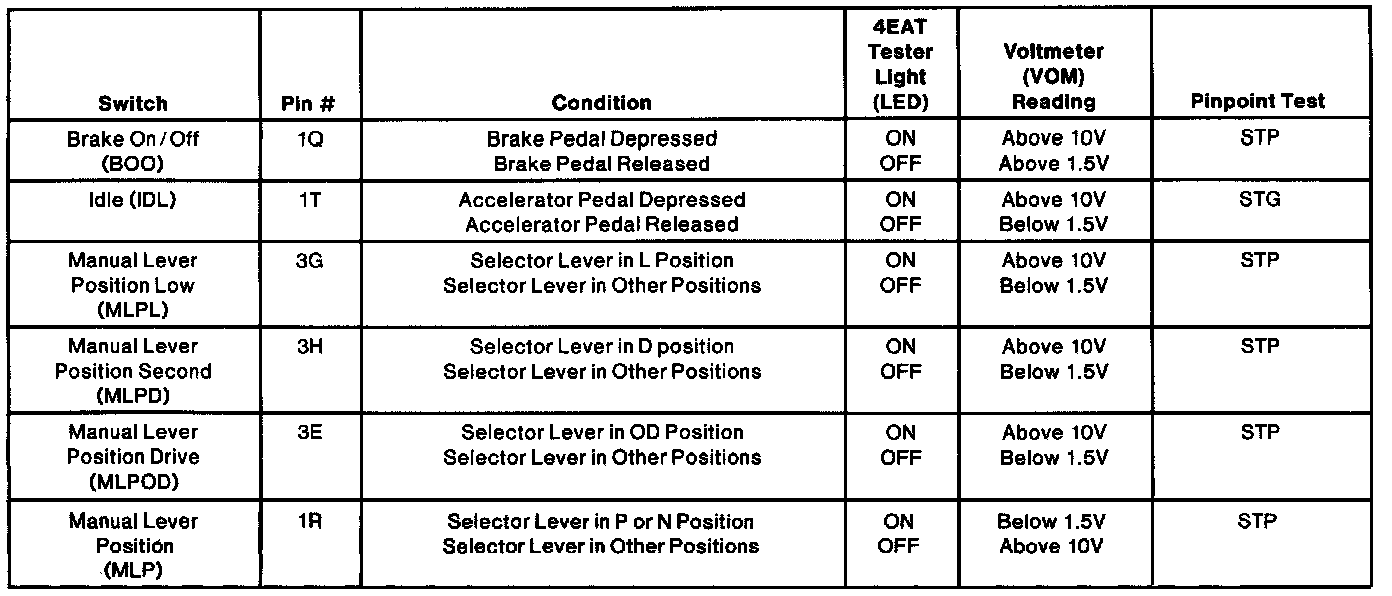 Any 4EAT diagnostic trouble codes will be erased when the PCM is disconnected from the vehicle wiring harness. Perform the Quick Test before performing the Switch Monitor Test.