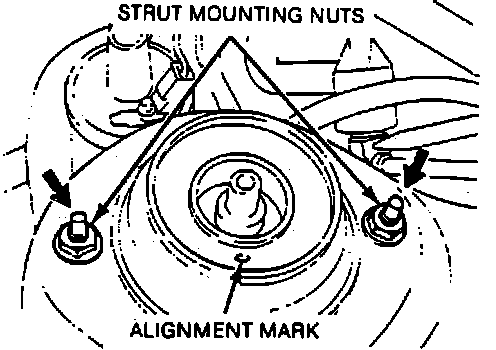 Camber angle, Fig. 1, is controlled by the position of the strut mounting block in the shock tower. The mounting block can be positioned in the tower in two ways, resulting in a camber variation of approximately 1/2°. If the camber setting has not been changed previously, the white alignment mark on the mounting block will be positioned on the outboard side of the strut assembly, Fig. 2. Changing the position of the alignment mark 180° will increase camber angle approximately 1/2°, Fig. 3. If the alignment mark is already positioned inboard of the strut, changing the mounting block position can only result in camber being reduced by approximately 1/2°. To adjust camber setting, proceed as follows: