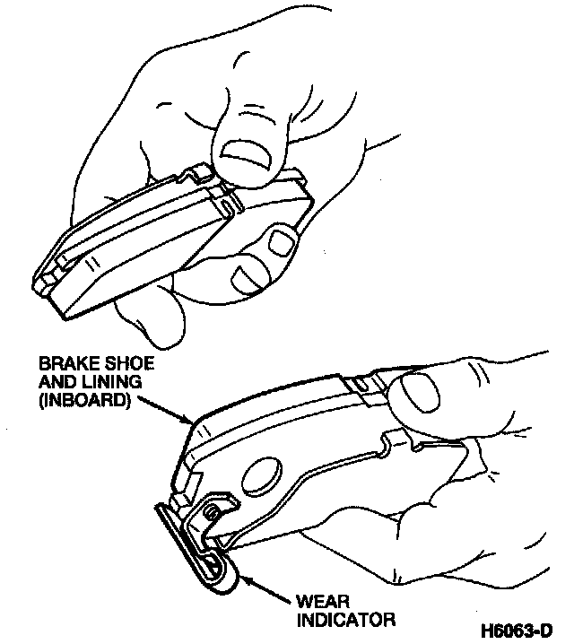 2. Install the brake shoes and linings into the front disc brake caliper anchor. The brake shoe and lining with the wear indicator is the INBOARD brake shoe and lining.