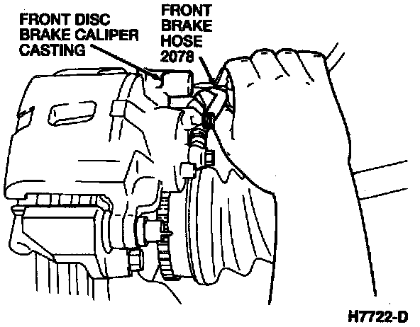 CAUTION: Position the front brake hose out of the way of the front disc brake caliper casting to avoid cracking the front brake hose.