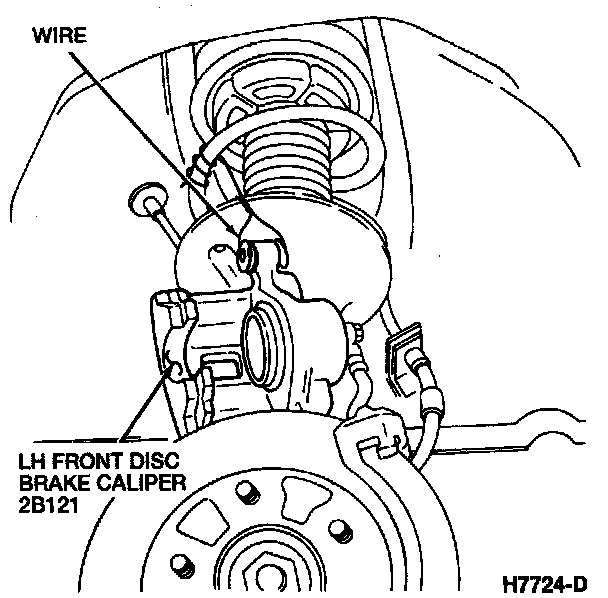 6. Using a piece of wire, support the front disc brake caliper from the front coil spring.