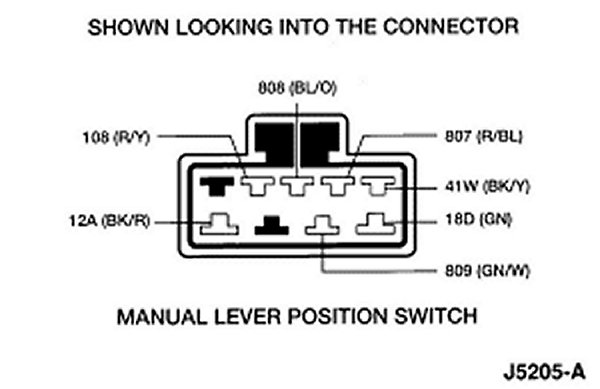 4. Retest continuity with the selector lever in PARK or NEUTRAL position after performing adjustment. If continuity does not exist, replace the manual lever position switch.