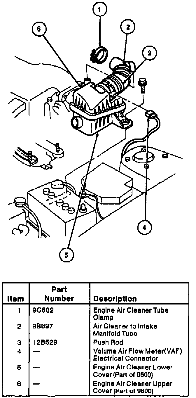 3. Loosen the screw-type engine air cleaner tube clamp securing the air cleaner to intake manifold tube to the Volume Air Flow (VAF) and pull the air cleaner to intake manifold tube from the volume air flow meter.