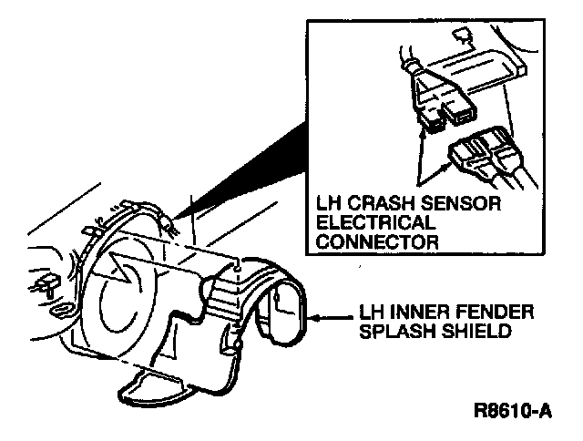5. Remove the LH crash sensor electrical harness from the fender apron attaching clip and disconnect the LH crash sensor electrical connector.