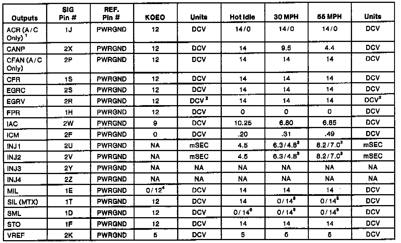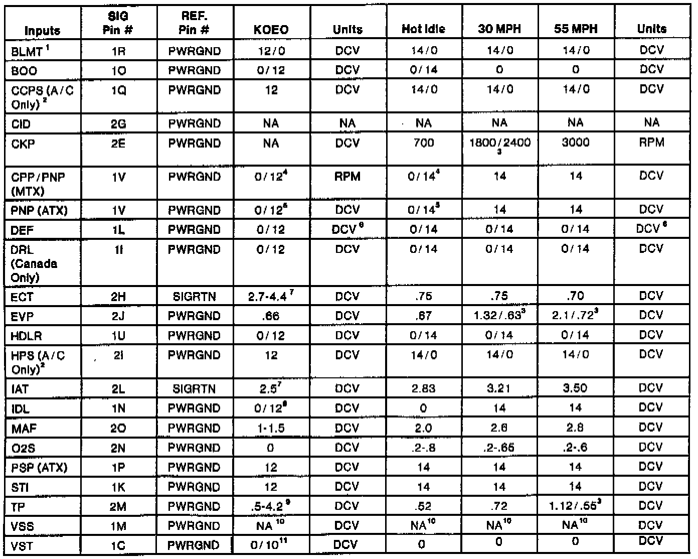 NOTE: For tests involving switches the values will be: switch OFF (released) / switch ON (depressed).NOTE: The PCM is not fully compatible with the EEC-IV Monitor. Because of this, some inputs and outputs register faulty readings. These pins read NA (Not Applicable) for reference values. These pins may be monitored using a Breakout Box.