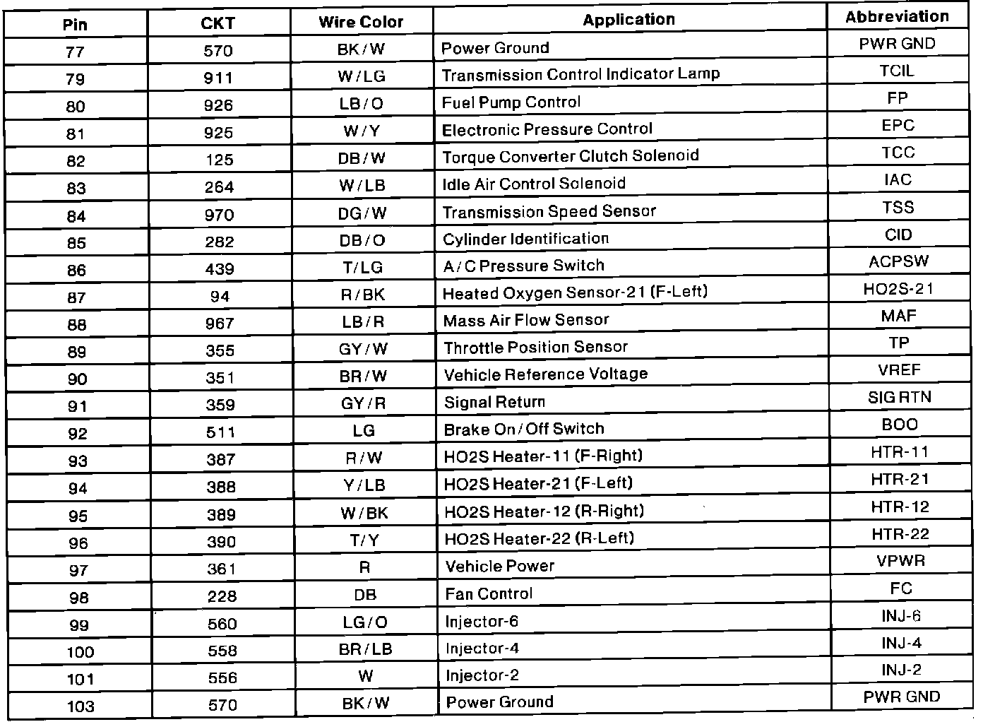 PCM Connector Pin Usage (part 2 Of 2):