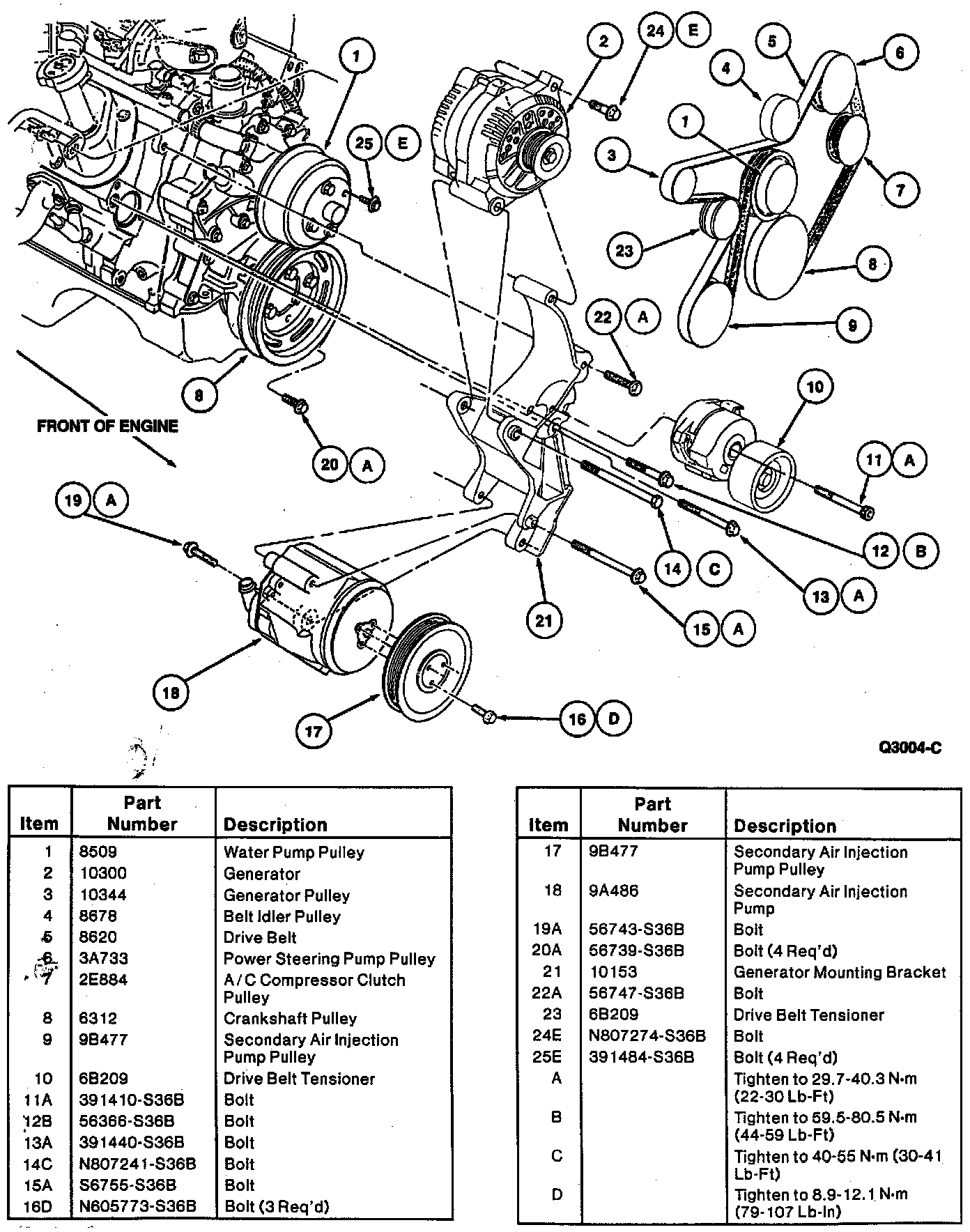 CAUTION: Ensure belt is properly installed before starting engine, otherwise belt damage will occur.^ Conditions requiring drive belt replacement are excessive wear, rib chunk-out, severe glazing, frayed cords. Replace any drive belt exhibiting one of these conditions.