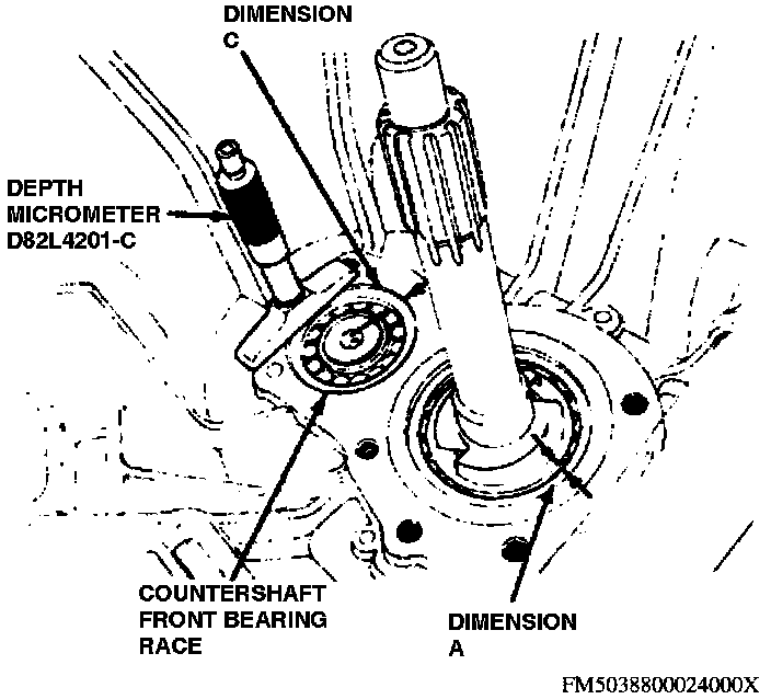 8. Install countershaft front bearing by hand. If any related parts are replaced, measure dimensions A, B, and C. After measuring all dimensions, select proper bearing shim to maintain endplay specifications.