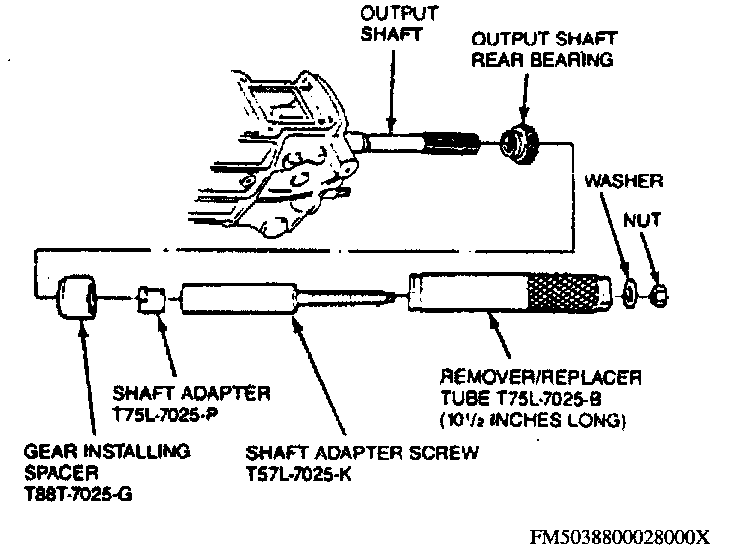 32. Install output shaft rear bearing using gear installing spacer tool No. T88T-7025-G, shaft adapter tool No. T75L-7025-P, shaft adapter screw tool No. T75L-7025-K, remover/replacer tube tool No. T75L-7025-B, or remover/replacer tube tool No. T85T-7025-A nut and washer or equivalent.