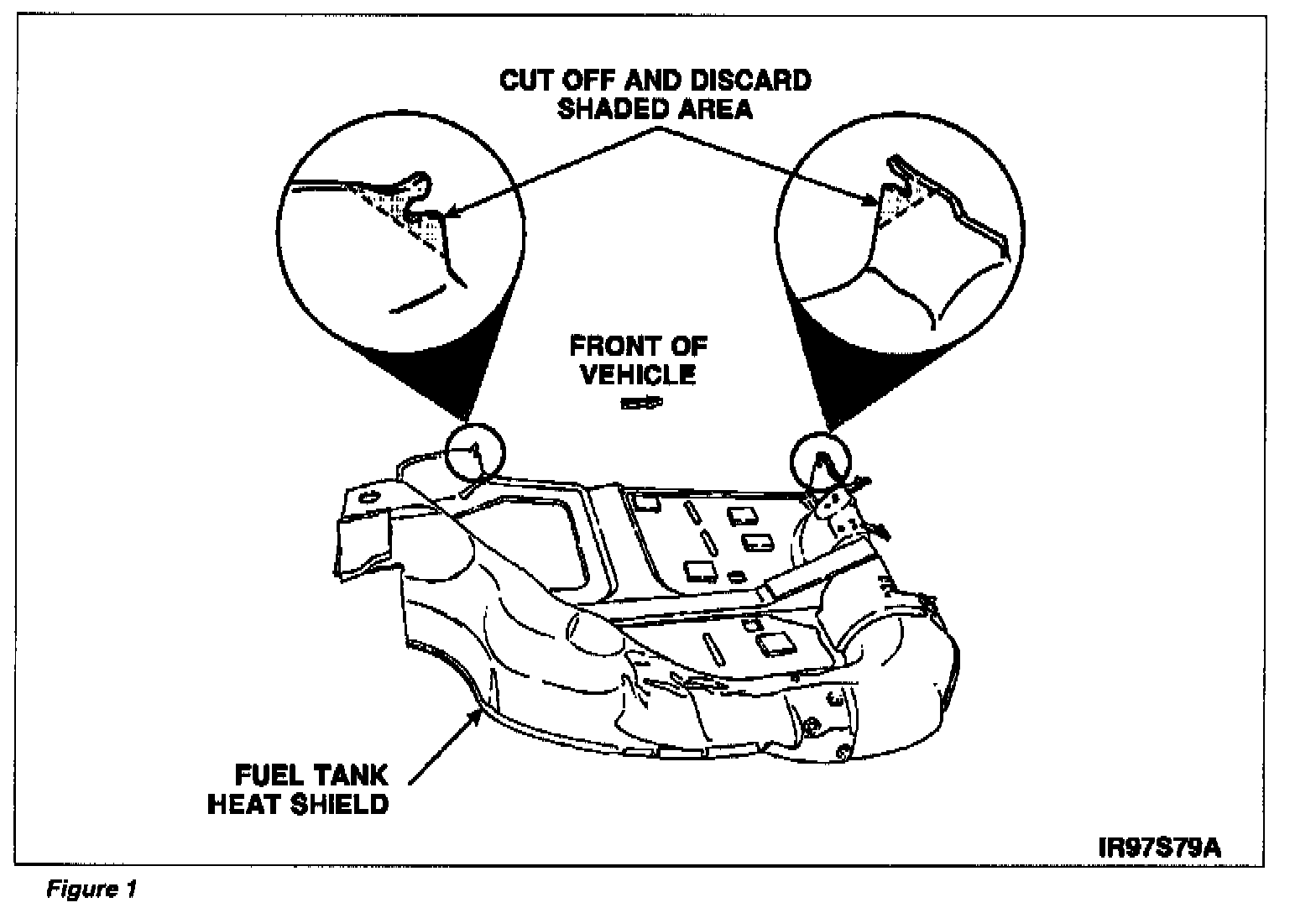 ^ Prior to installing the new fuel tank, cut the heat shield retaining tabs as shown in Figure 1.