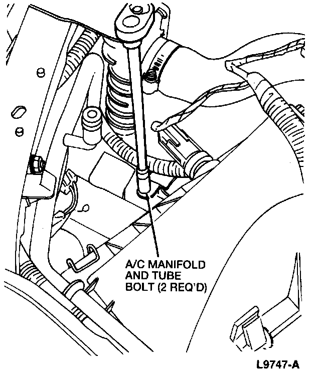 7. Lower the A/C manifold and tube out of the engine compartment.