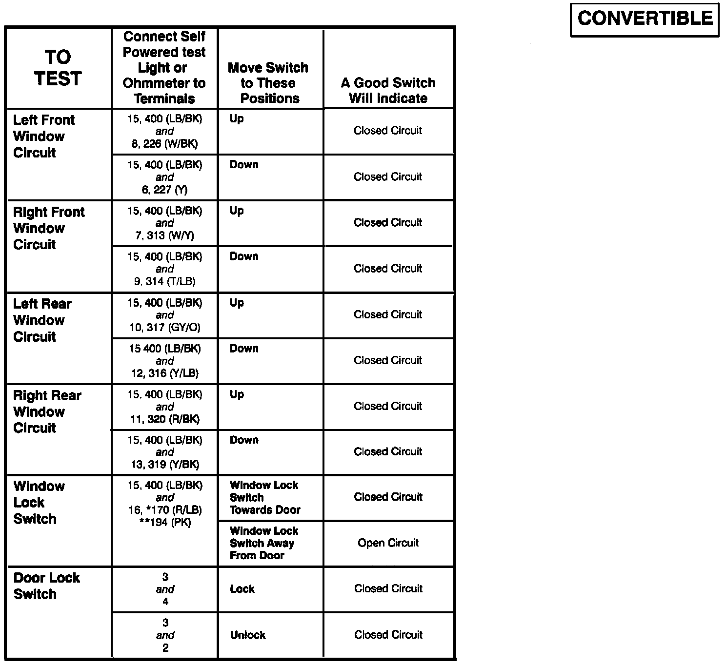 Master Window/Door Lock Control Switch (Convertible) - Component Testing Procedure (Part 1 Of 2):