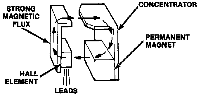 When a tab is in the magnetic path, the field strength decreases (shunted through the tab), and there is no output from the element.