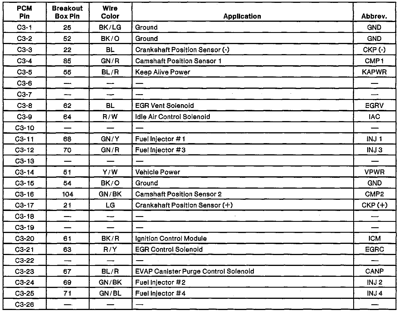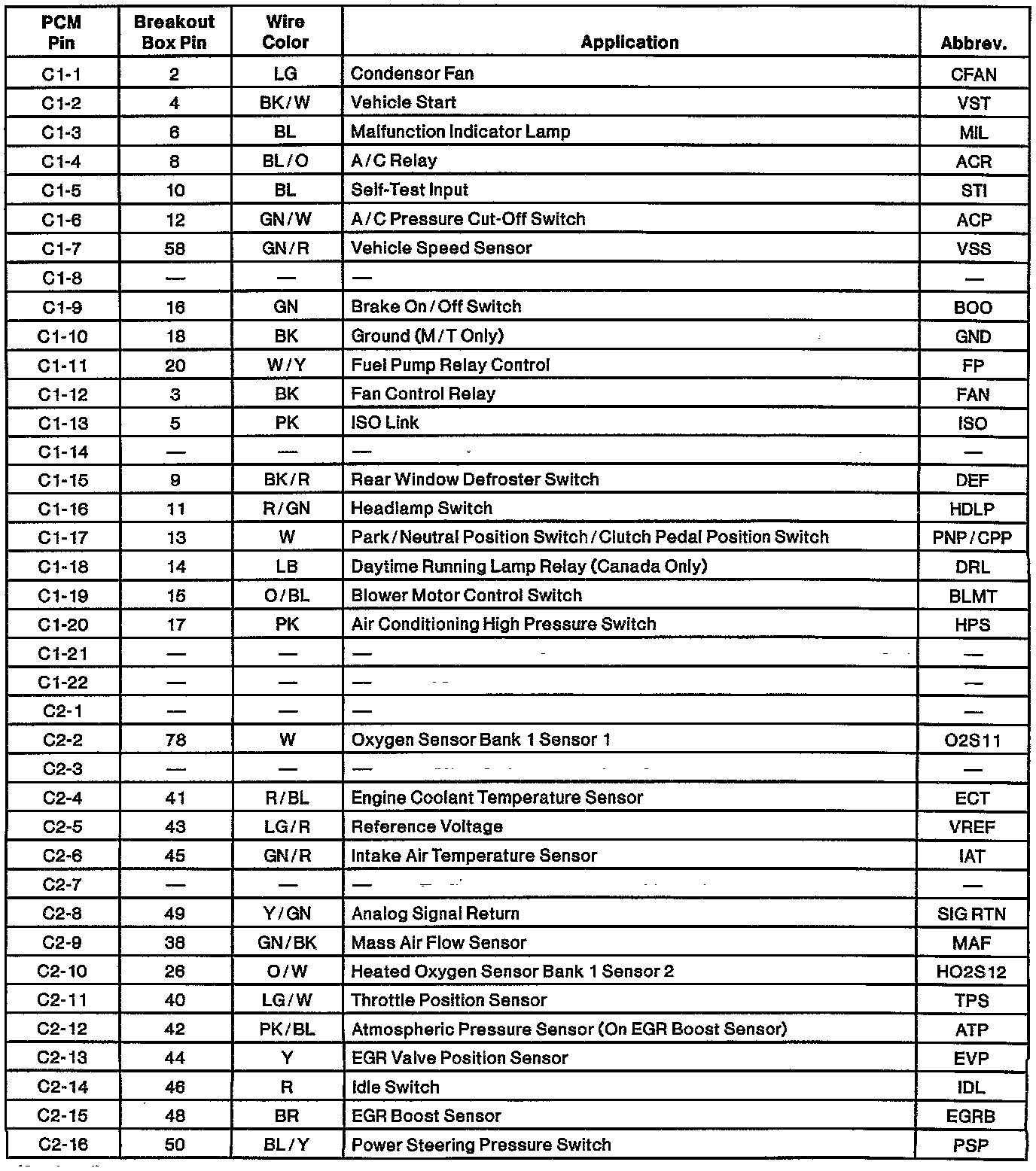 Powertrain Control Module (PCM) Connector Pin Usage: