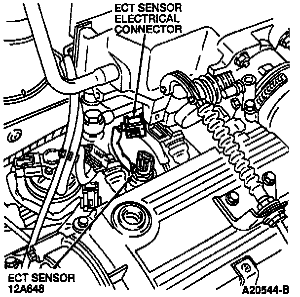 The Engine Coolant Temperature Sensor is located at the top RH front of the engine, in the intake manifold coolant passage.