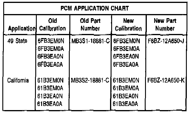 1. Replace the PCM with the revised PCM listed in the PCM Application Chart and retest. Refer to the 1996 Aspire Service Manual, Page 03-14-5, for PCM replacement.