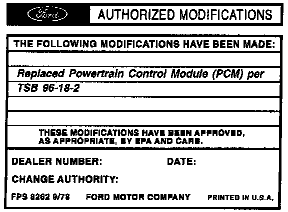 Obtain an Authorized Modifications Decal and list the date, dealer number, and summary of modifications performed. Select a prominent place adjacent to the Vehicle Emission Control Information Decal suitable for installing the Authorized Modifications Decal. Clean the area, install the decal, and cover it with a clear plastic decal shield.