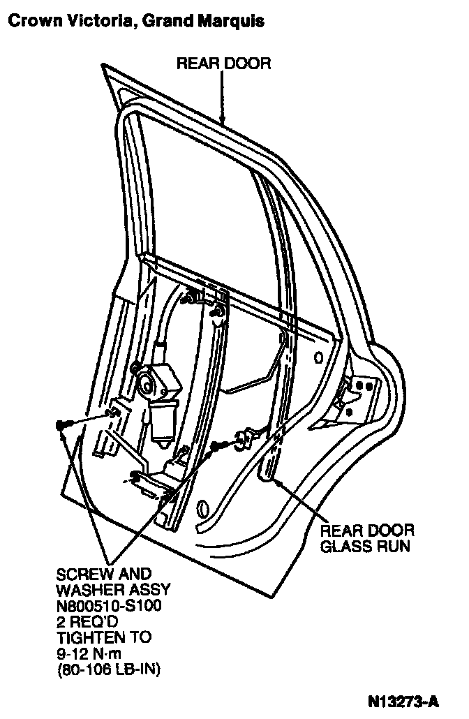 3. To install, reverse Removal procedure. Adjust rear door window glass. Tighten door glass run retainer screws to 9-12 N.m (80-106 lb-in).