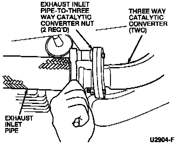 1. Remove the two exhaust inlet pipe-to-three way catalytic converter nuts and washers.