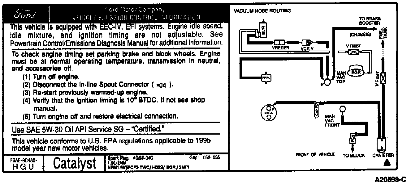 The exhaust emission control system is listed on the Vehicle Emission Control Information (VECI) decal on the underside of the hood. An underhood vacuum schematic is also located on the decal.