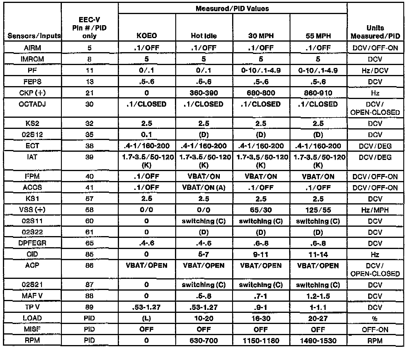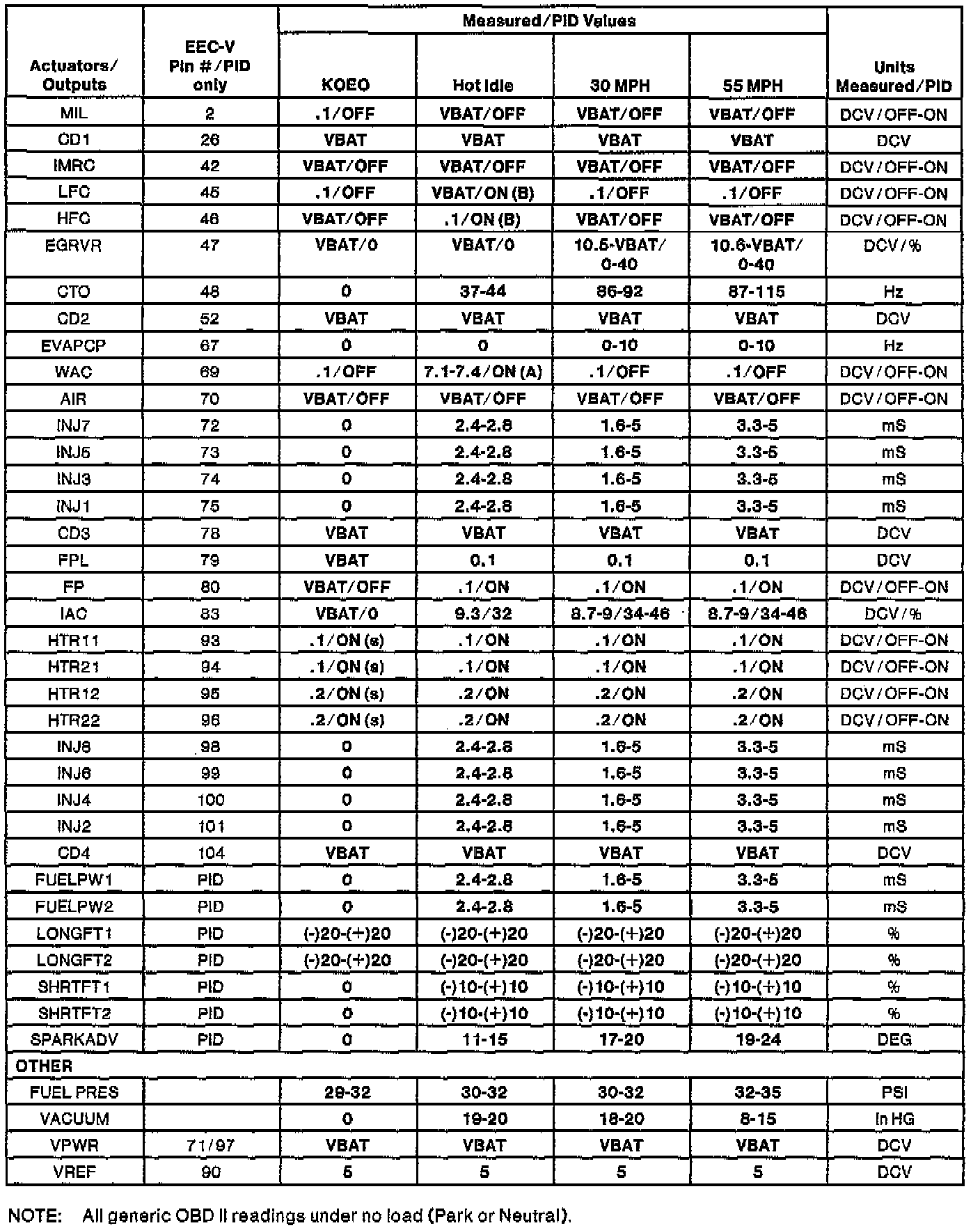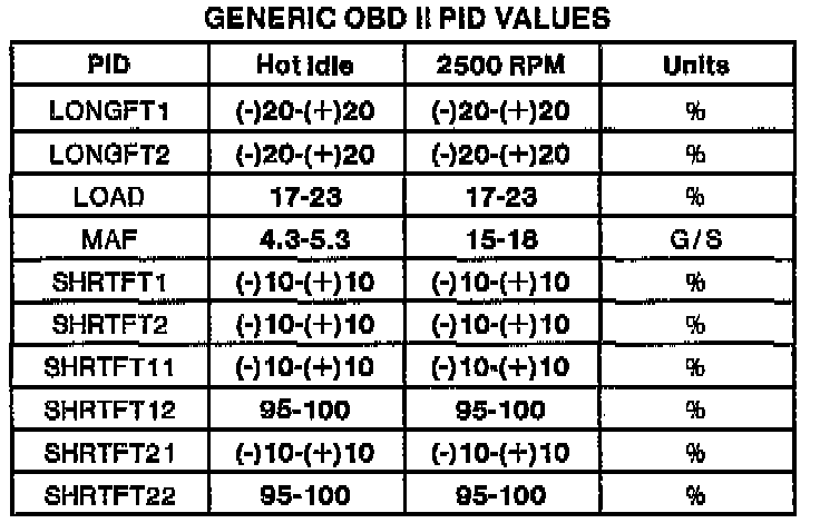 NOTE: All generic OBDII readings under no load (PARK or NEUTRAL).