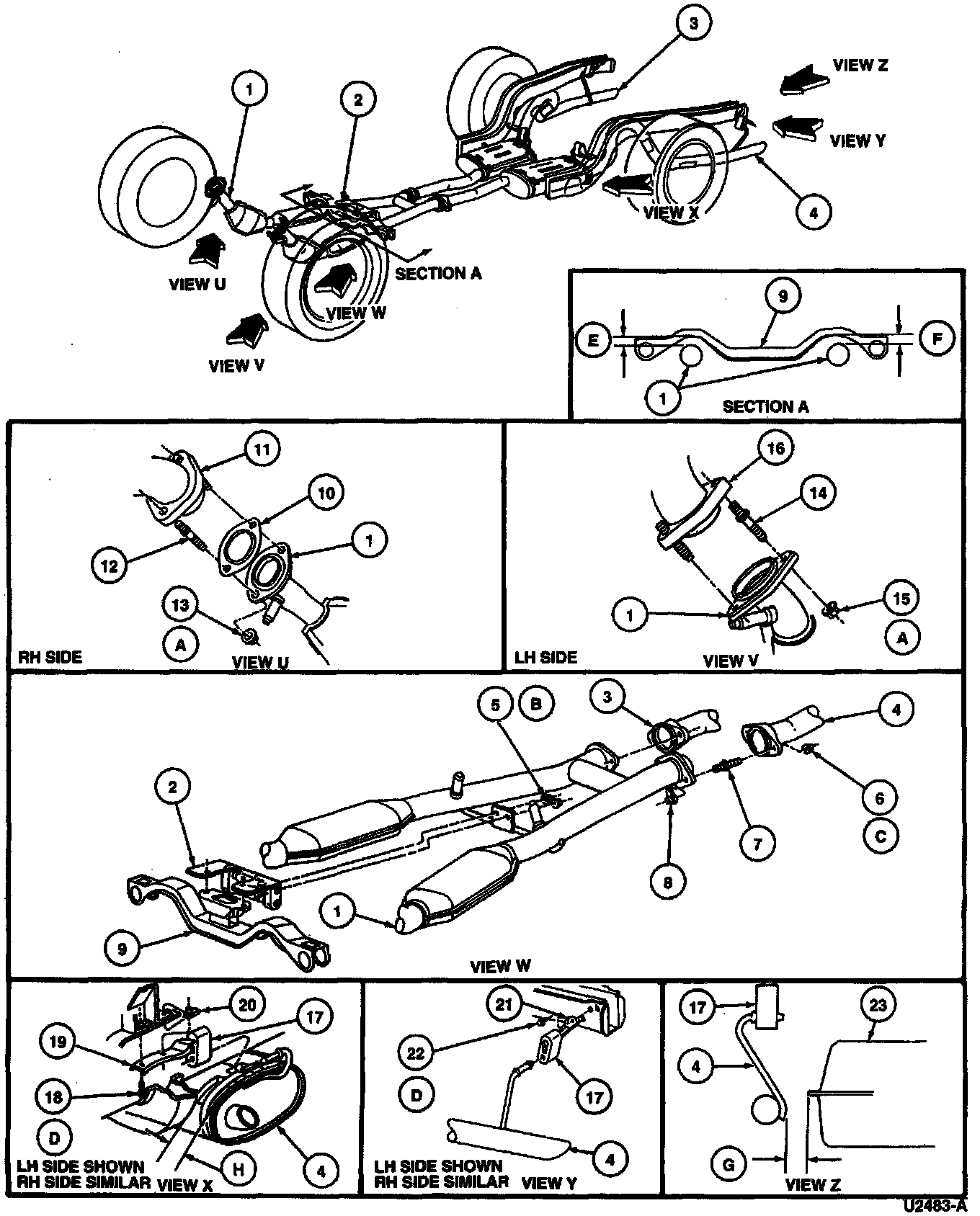CAUTION: When servicing exhaust system or removing exhaust components, disconnect all heated oxygen sensors at the wiring connectors to prevent damage to the heated oxygen sensors and wiring harness.Exhaust System: