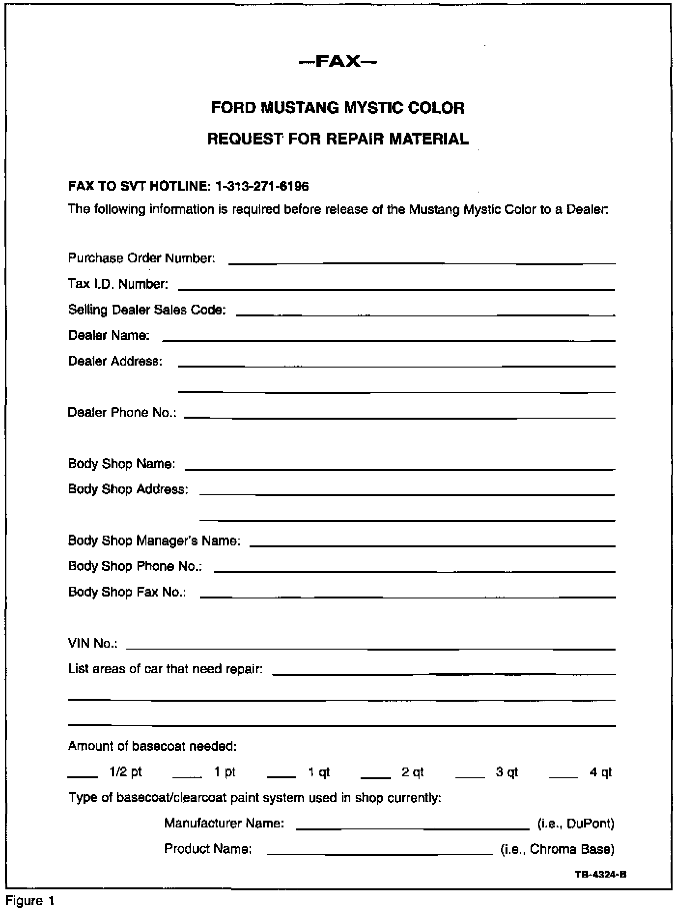 Due to the limited number of vehicles built (2000) and the amount of paint material available, the repairing facility (dealer or independent) must fax the required information on the form (Figure 1) to the SVT Hotline (1-313-271-6196).