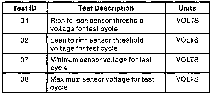 The Oxygen Sensor (O2S) Monitoring Test Results allows access to the on-board 02S sensor fault limits and actual values during the OBD II Drive Cycle. The test cycle has specific operating conditions that must be met (engine temperature, load, etc.) for completion. This information helps to determine the efficiency of the exhaust catalyst. Listed below are the tests and test identification numbers that are available.