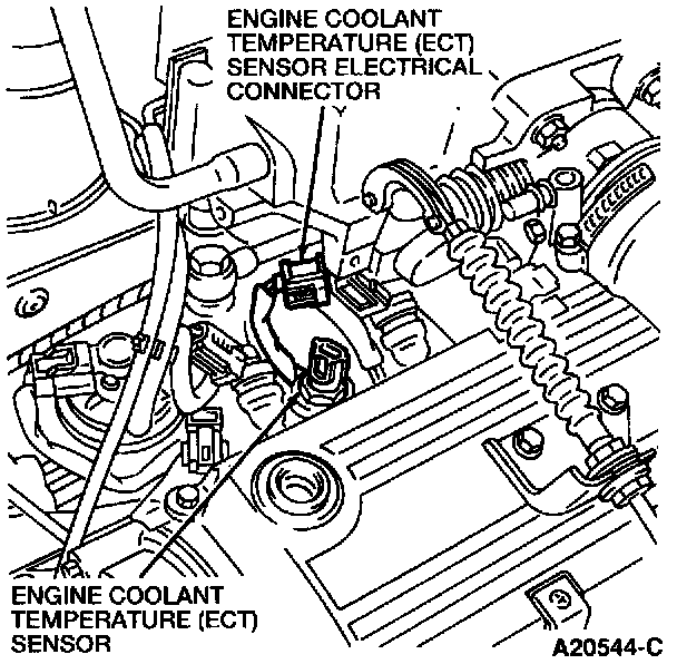 The Engine Coolant Temperature Sensor is located at the top RH front of the engine, in the intake manifold coolant passage.