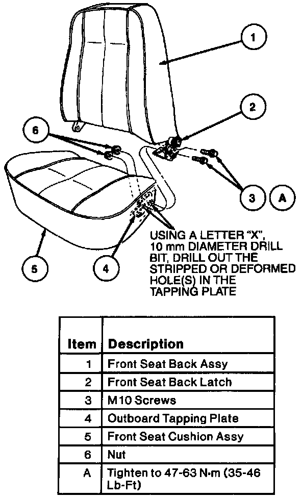 Position the front seat back frame to the front seat cushion frame and spring. Install the two new screws at the outboard attachments. For the previously drilled tapping plate hole(s), install a nut on the screw. tighten the screws to 47-63 N.m (35-46 Lb-Ft). Install the removed inboard pivot bolt. Tighten the bolt to 19-27 N.m (14-19 Lb-Ft).