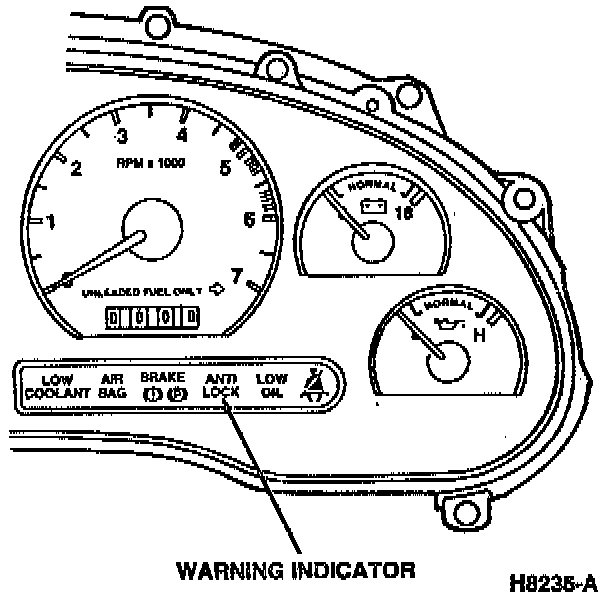 If a fault is detected in the system, a DTC will be stored in the anti-lock brake control module memory, and the instrument panel ANTI-LOCK warning indicator will illuminate when the engine is running. The anti-lock brake control module has the ability to store three DTCs in memory.