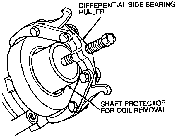5. Install Differential Side Bearing Puller T77F-4220-B1 on the A/C compressor. Place the tip of the puller forcing screw in the center pilot of the shaft protector and the jaws of the puller around the back edge of the A/C clutch field coil.