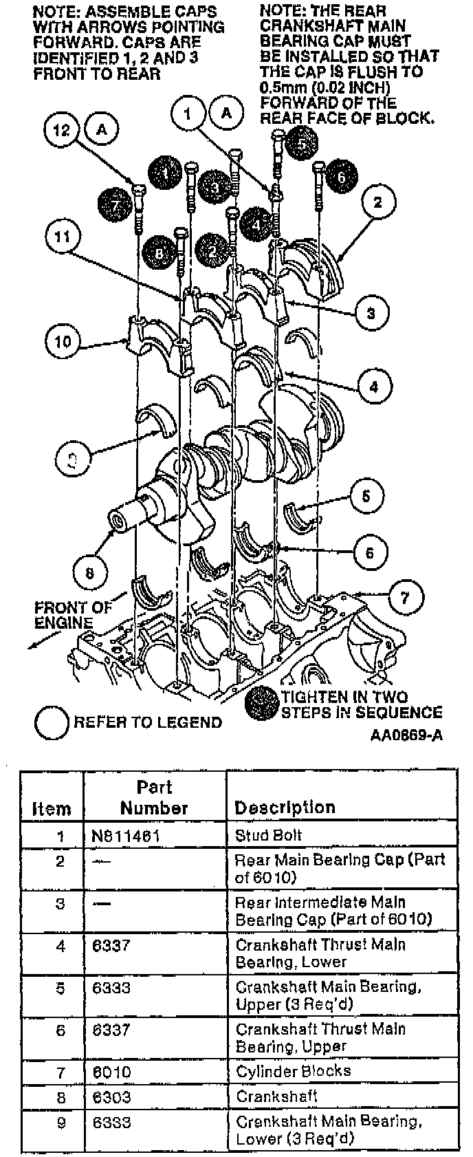 NOTE: Follow the proper tightening procedure for the bearing cap removed. Lubricate bearing surfaces with Engine Assembly Lubricant D9AZ-19579-D or equivalent meeting Ford specification ESR-M99C80-A.