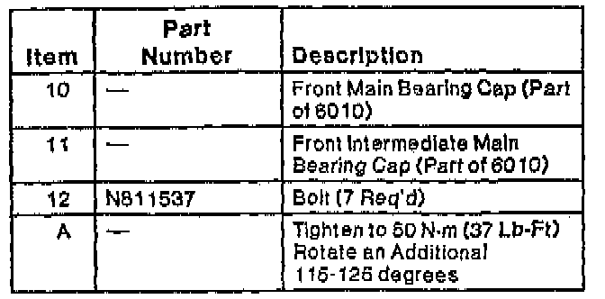 C. While holding crankshaft forward tighten crankshaft main bearing cap retaining bolts to 110-120 Nm (82-88 ft. lbs.).