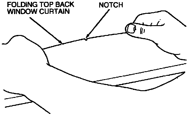 2. Align notch at top of back window glass with center point mark on folding top rear number 4 bow. Staple folding top back window curtain to tacking strip along folding top rear number 4 bow.