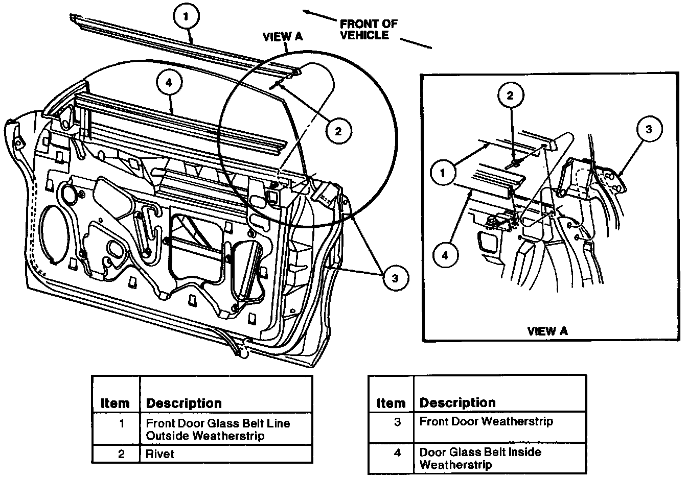 3. To remove front door belt line outside weatherstrip, first remove rivet at outer end of front door belt line outside weatherstrip. Remove rear view mirror mounting hole cover and loosen outside rearview mirror retaining bolts. Then carefully pry up on front door belt line outside weatherstrip and remove from flange on front door.