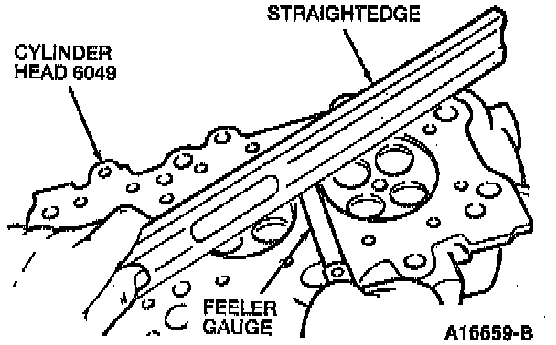 CAUTION: The cylinder head must be replaced if the cylinder head height is not within 124.45-124.55 mm (4.8996-4.9035 inches). Do not plane or grind more than 0.15 mm (0.006 inch) from the original head gasket surface. If it is necessary to refinish the head gasket surface, do not grind off more than 0.15 mm (0.006 inch) from the original thickness.Maximum distortion for the cylinder head is 0.1O mm (0.004 inch). If the cylinder head distortion exceeds specification, grind the cylinder head surface.