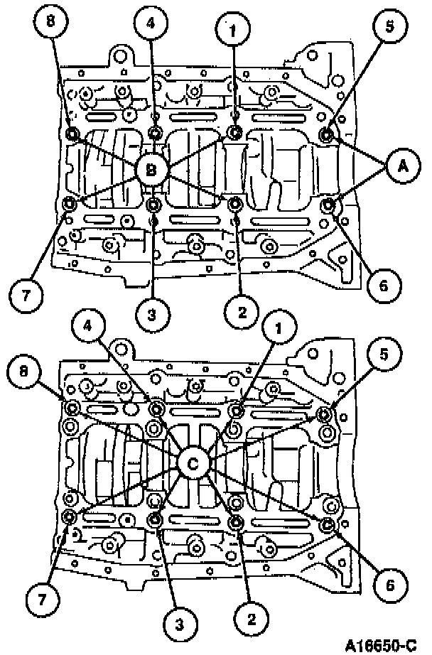 1. Tighten lower cylinder block bolts A and B in two or three steps in the order shown to 23-25 Nm (17-19 ft. lbs.). Tighten lower cylinder block bolts C in two or three steps in the order shown to 18-21 Nm (13-15 ft. lbs.).