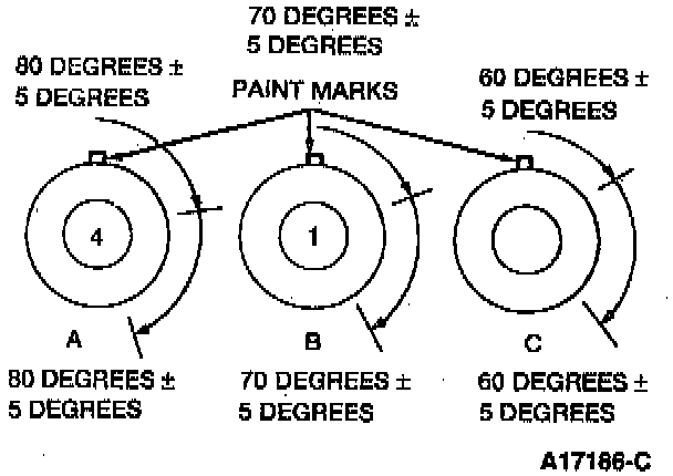 5. Using the marks as a reference, tighten lower cylinder block bolts C by turning them 60 ± 5 degrees.