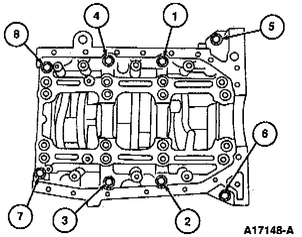 7. Tighten the lower cylinder block bolts in the order shown to 19-21 Nm (14-15 ft. lbs.).