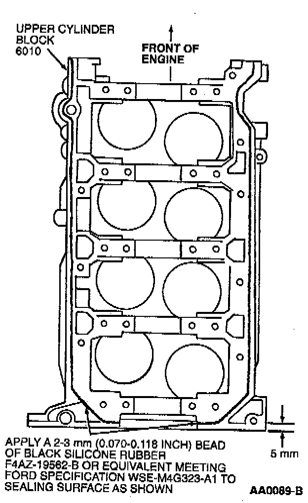 2. Apply a 2-3 mm (0.070-0.118 inch) bead of Black Silicone Rubber F4AZ-19562-B or equivalent meeting Ford specification WSE-M4G323-A1 to lower cylinder block sealing surface of cylinder block as illustrated.