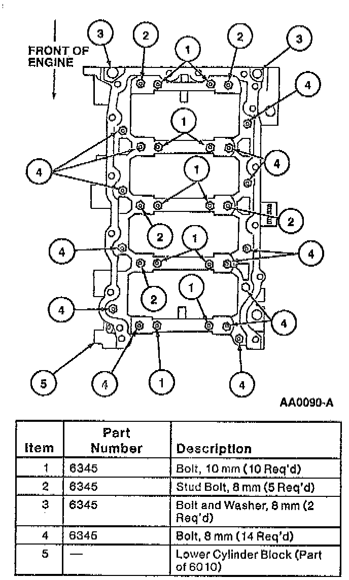 4. Install all lower cylinder block-to-upper cylinder block retaining bolts.
