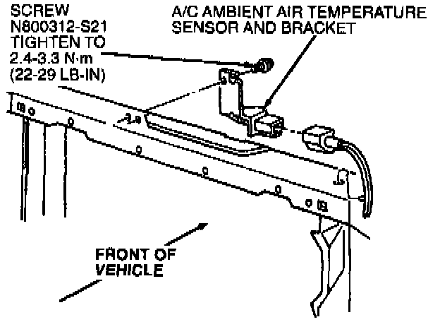 3. Position A/C ambient air temperature sensor and bracket and install retaining screw. Tighten to 2.4-3.3 N.m (22-29 lb-in).