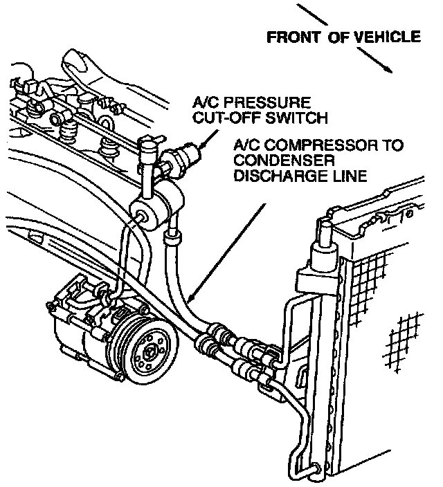 1. Locate the A/C pressure cut-off switch on the A/C compressor to condenser discharge line.