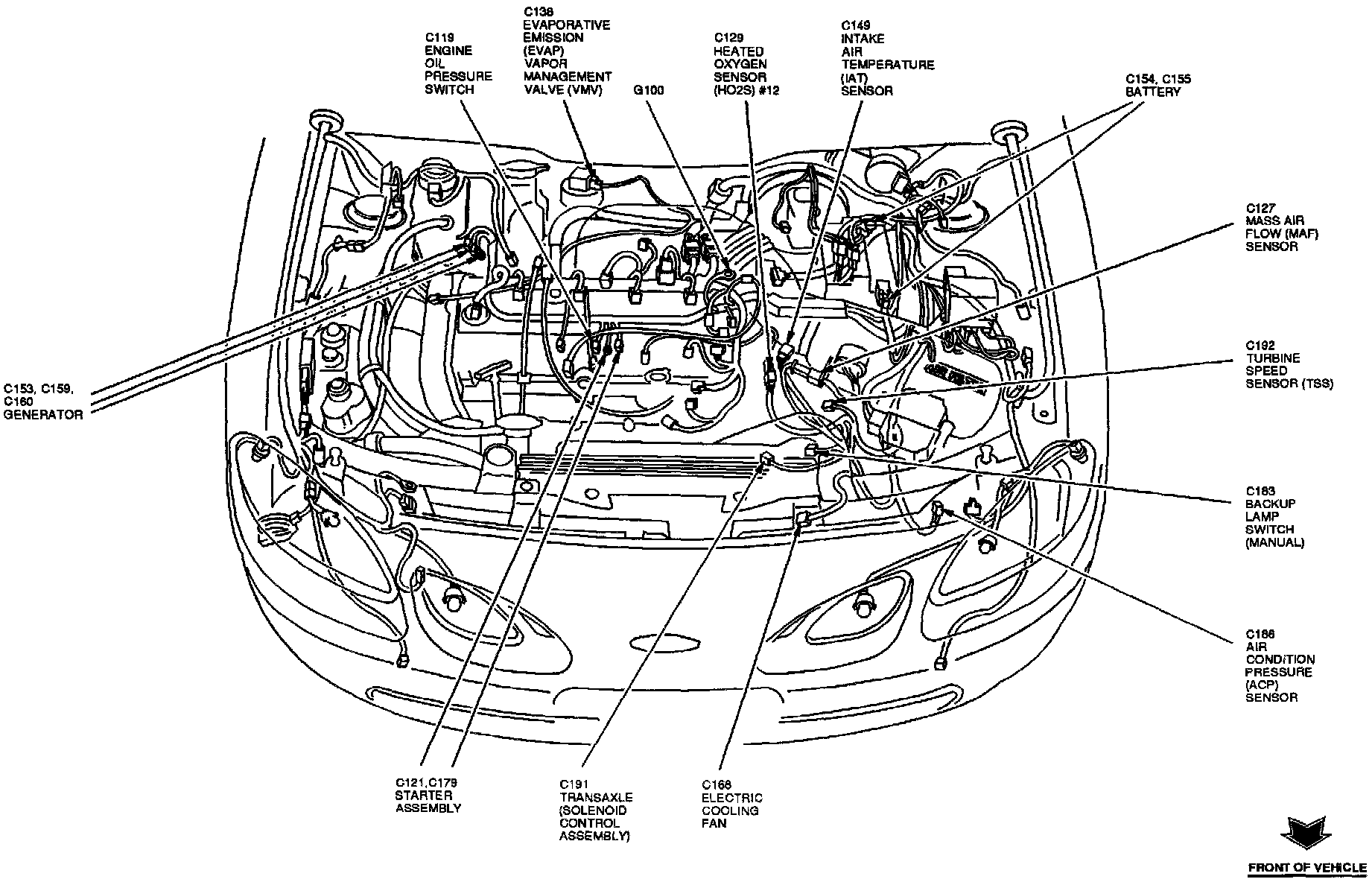 The Mass Air Flow Sensor is located at the top LH front of the engine compartment, on inside of the air cleaner assembly.