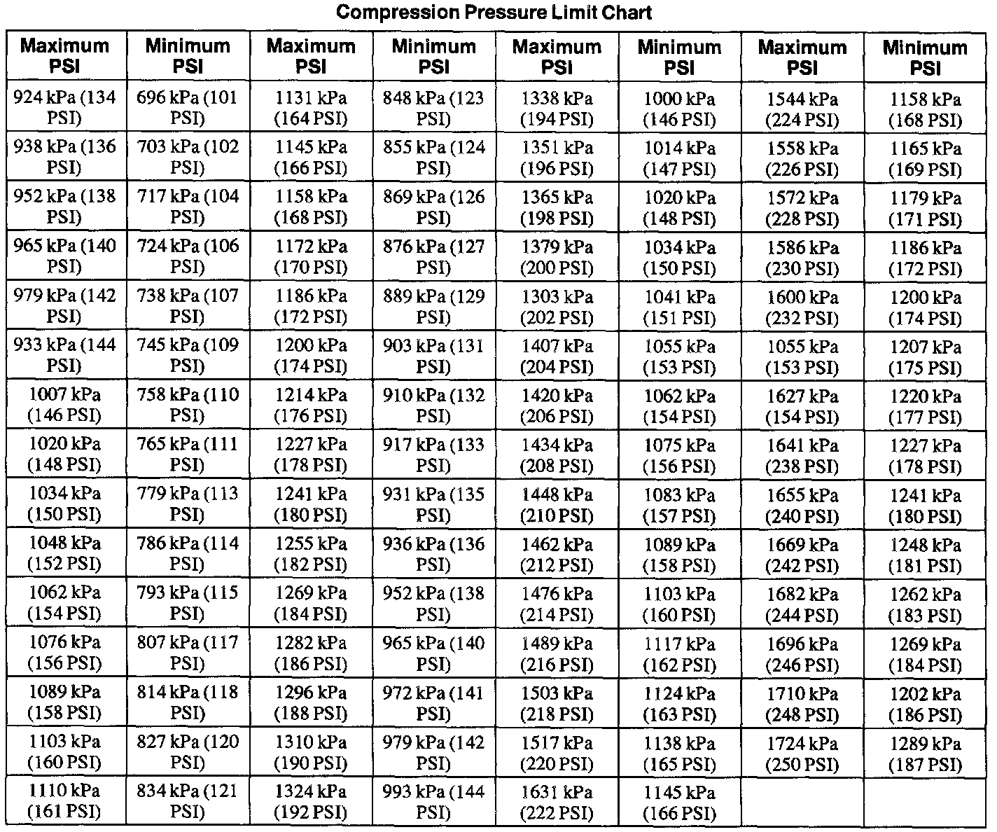 3. If two adjacent cylinders indicate low compression pressures and squirting oil on piston does not increase compression, the head gasket may be leaking between cylinders. Engine oil and/or coolant in the cylinders could result from this condition. Use the Compression Pressure Limit Chart when comparing cylinder compression readings to determine if the lowest reading is within 75 percent of the highest reading.