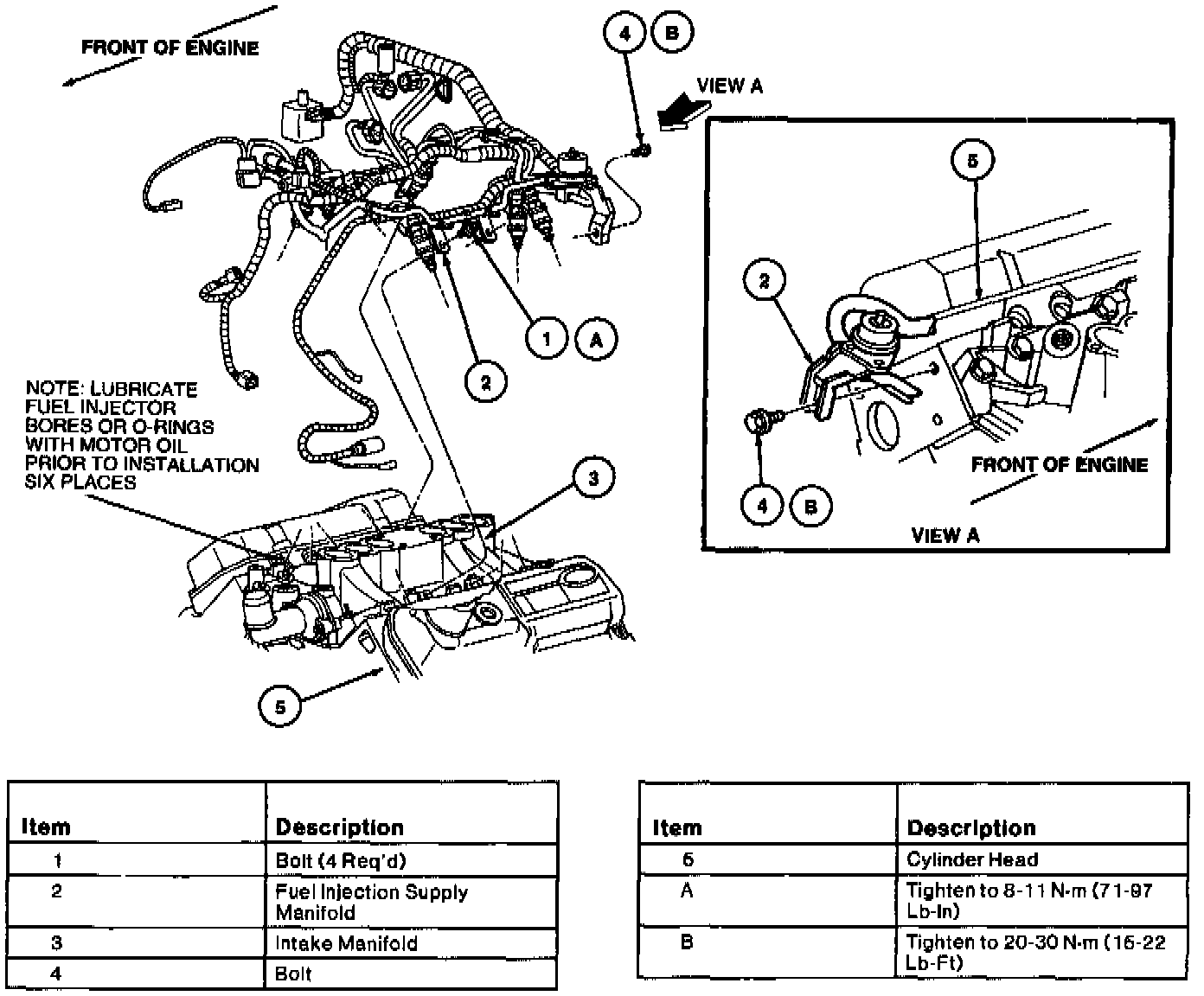 10. Install fuel injectors and fuel injection supply manifold. Tighten fuel injection supply manifold to lower intake manifold bolts to 8-11 Nm (71-97 in. lbs.). Tighten fuel pressure bracket bolt to 20-30 Nm (15-22 ft. lbs.).