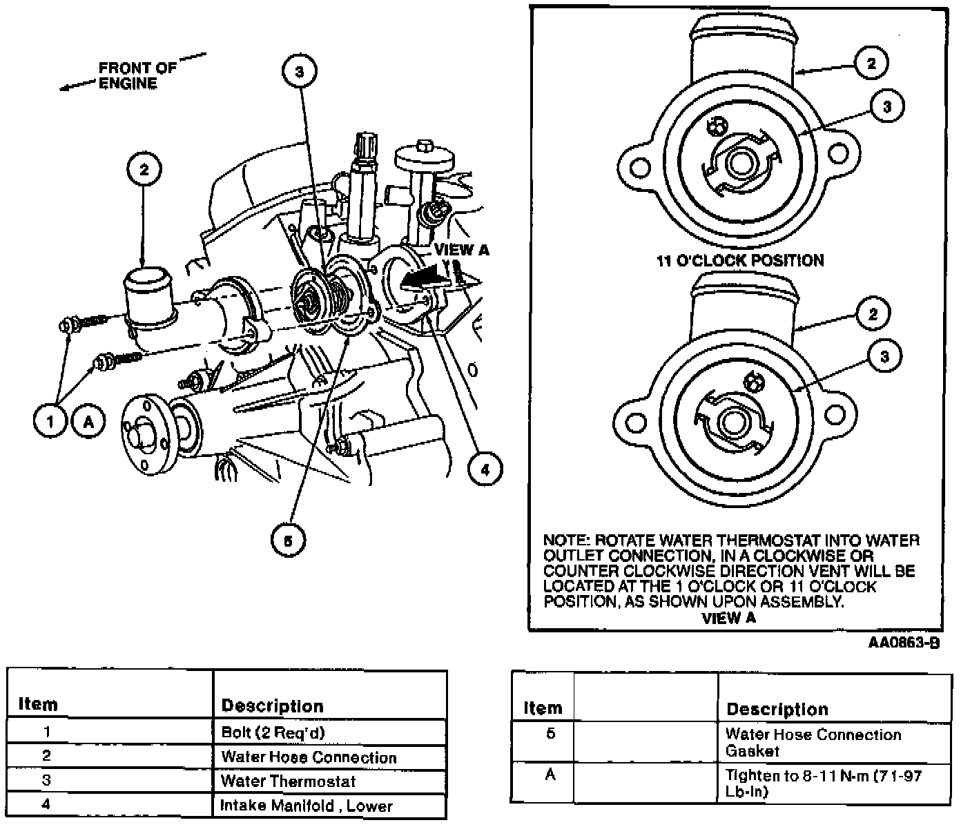 b. Install water hose connection (note direction) and water thermostat. Tighten retaining bolts to 8-11 Nm (71-97 in. lbs.).
